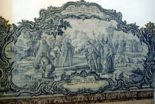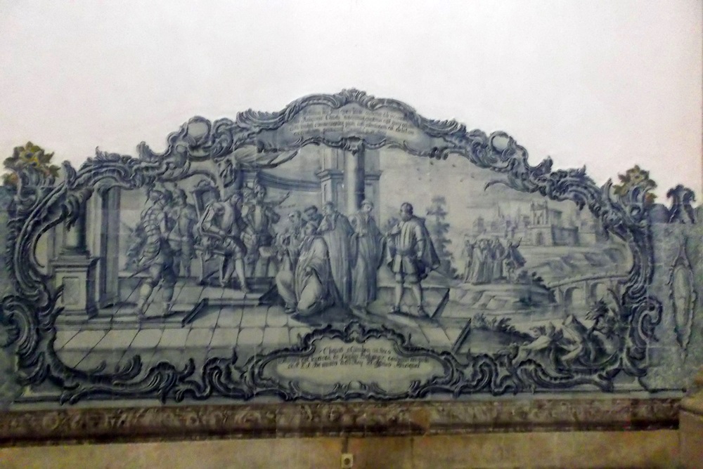 Na parte de baixo das estátuas dos reis em terracota, encontram-se belos painéis de azulejos, onde se narram cenas de vida na época.