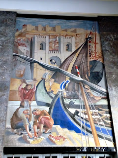 Este painel representa o milagre da Senhora da Nazaré. Penso que todos conhecem a lenda, mas reparem na pintura. D. Fuas Roupinho está vestido com um traje de cavaleiro tauromáquico. Os pescadores e as mulheres têm igualmente roupas da época, apesar da lenda ser do século XII