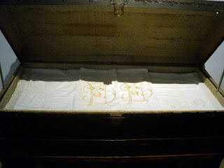 Uma mala de enxoval com bonitas peças bordadas. É evidente que se trata de peças de gente, com uma boa posição social.